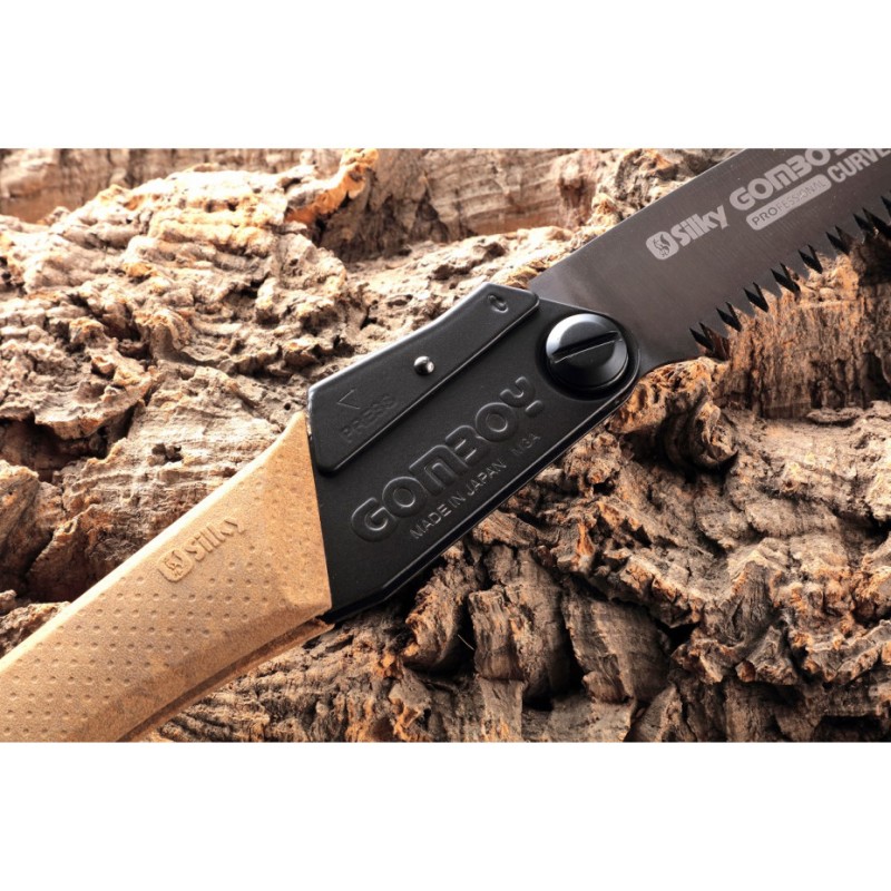The arbor composite handle is made of a wood/plastic composition, giving a warm and comfortable touch and superior control. The feel is a bit harder than the usual GOM rubber handle from Silky, but it offers more grip with greasy substances.
